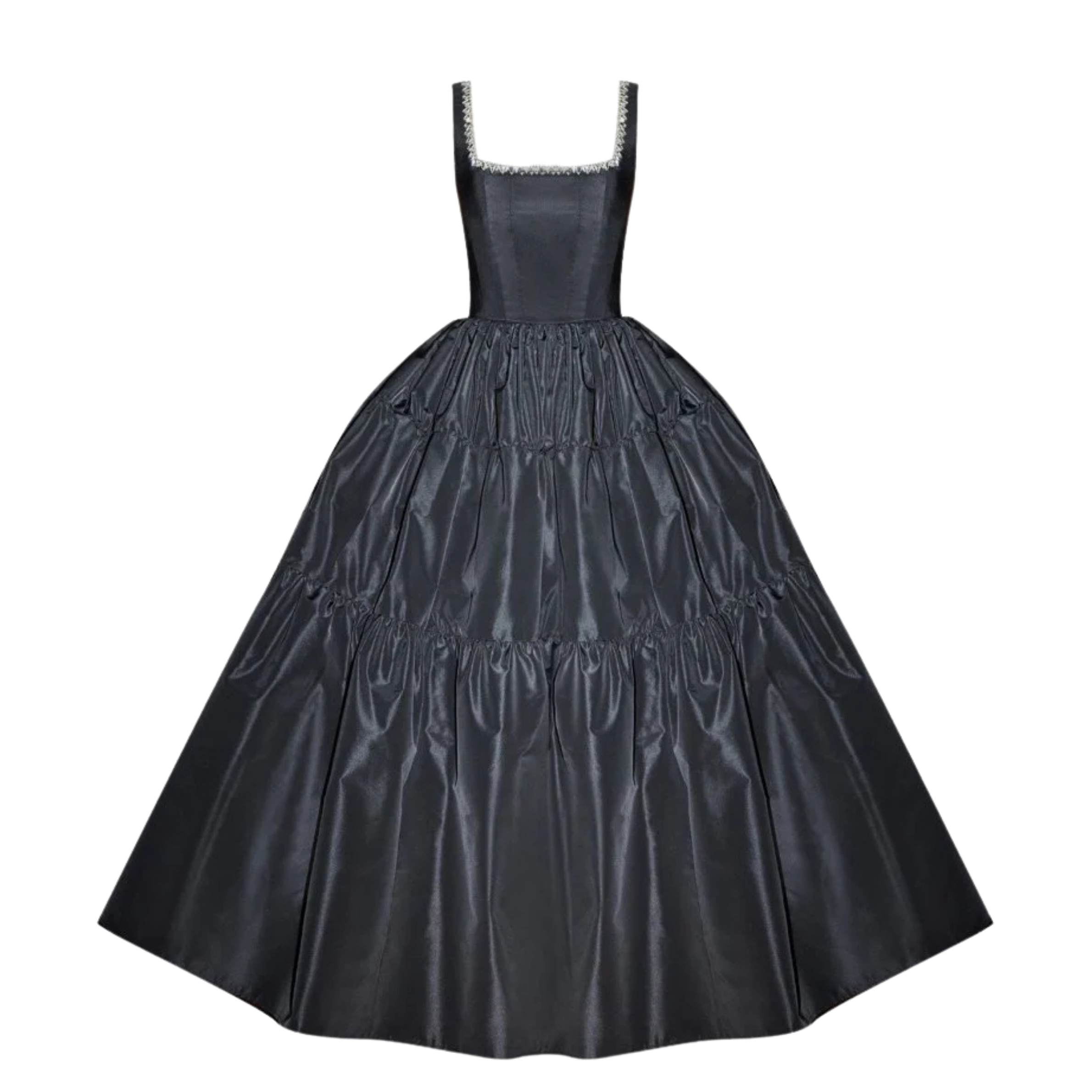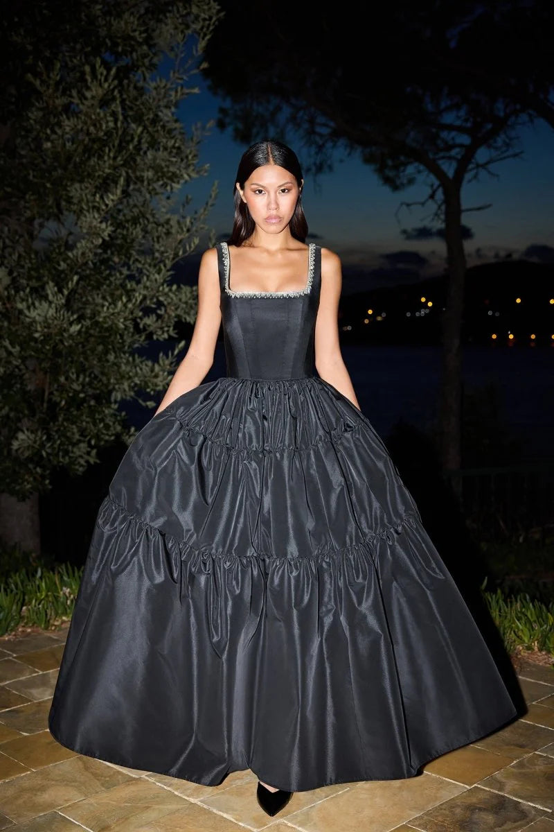 Romantic with a dramatic edge, the Gigiis Bliss Dress is crafted in lustrous black fabric with a structured bodice and a voluminous, tiered skirt. Delicate embellishment along the square neckline adds a subtle sparkle, while the full silhouette creates an unforgettable presence. Perfect for black-tie events, formal evenings, galas, fashion-forward weddings, and statement celebrations.