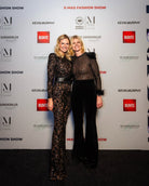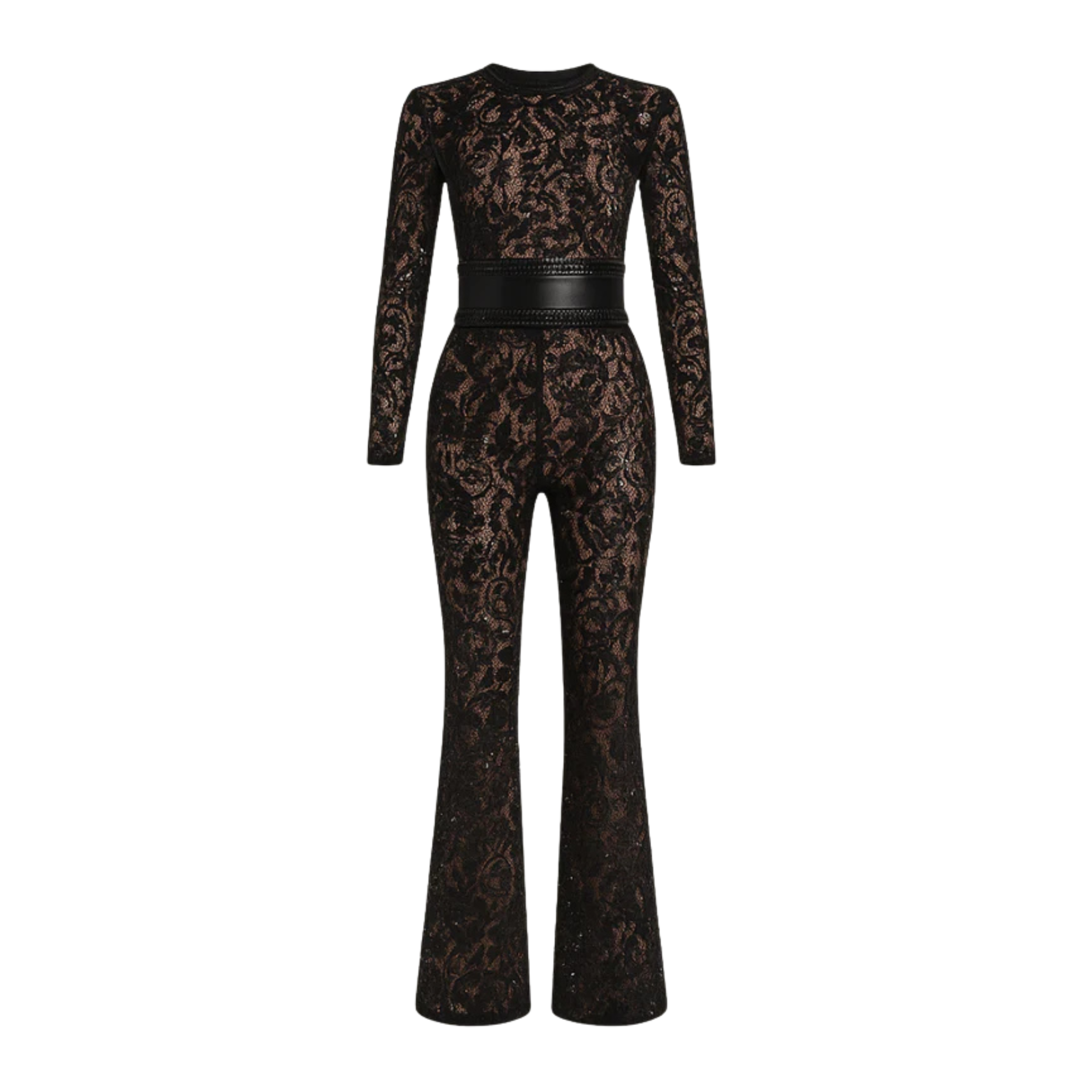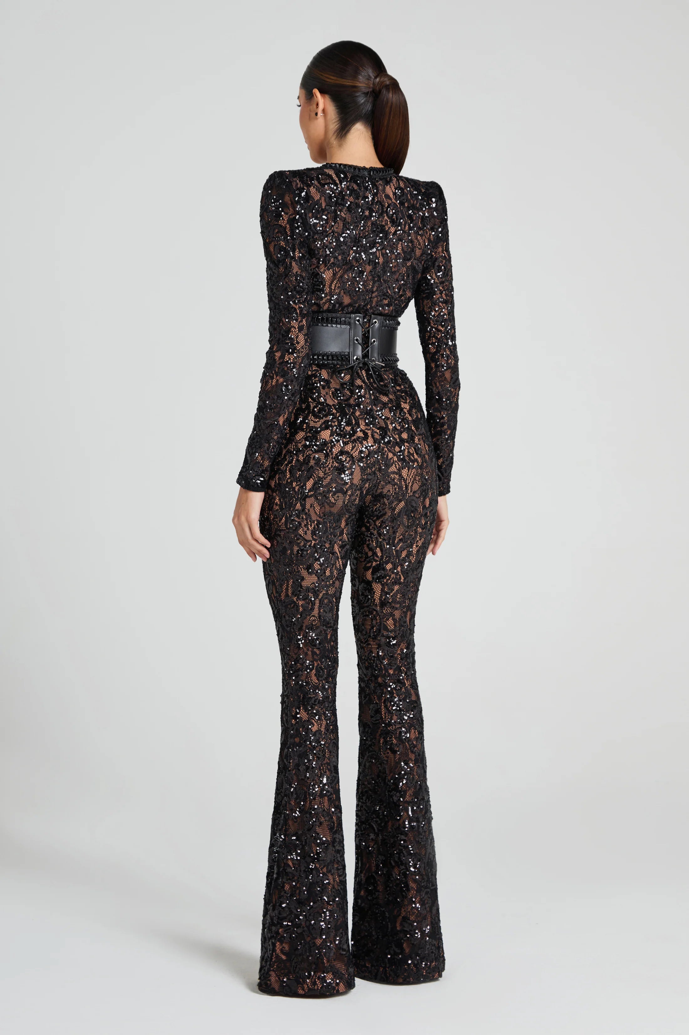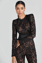 Dramatic, sculpting, and unapologetically glam, the Bella Jumpsuit brings high-impact sparkle with its black sequined lace, sharp shoulders, and flared leg. The structured corset belt cinches the waist for a powerful silhouette, perfect for black-tie events, cocktail parties, birthdays, or any night that calls for a standout entrance.