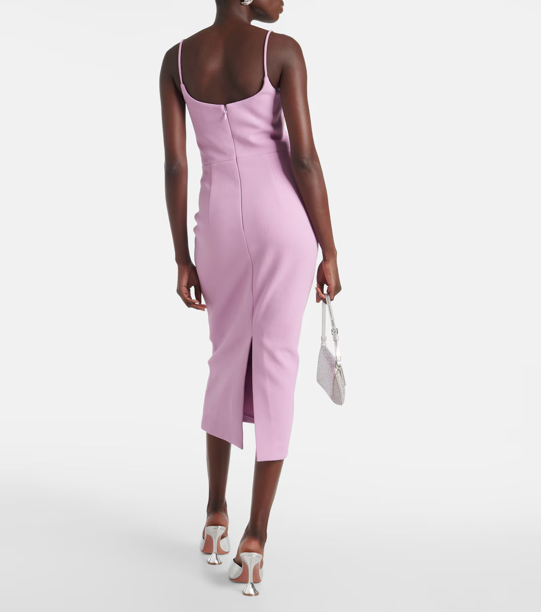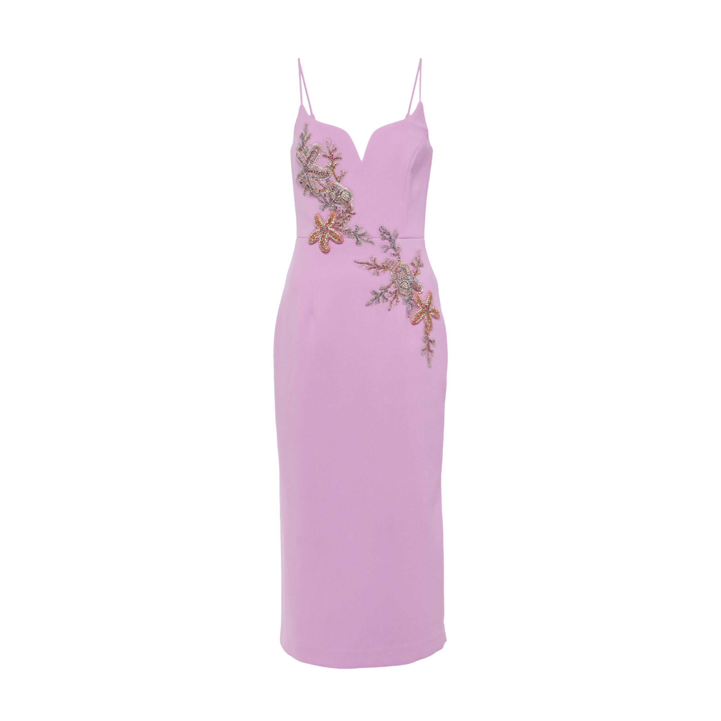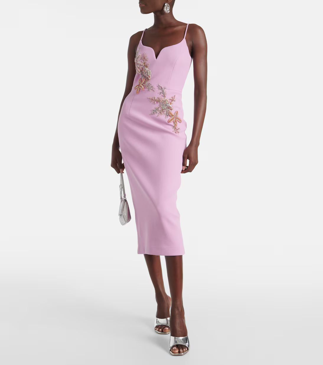 A soft lilac statement with sculpted lines and intricate floral beading, this midi dress brings refined drama to any occasion. Its sleek silhouette and sweetheart neckline create an elegant, feminine mood — perfect for weddings, cocktail parties, engagements, or sunset celebrations.
