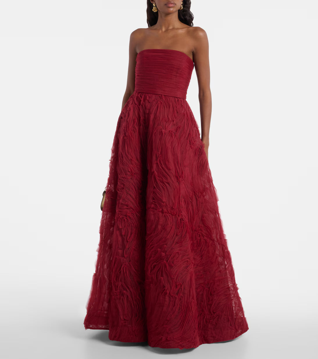 The Willow gown brings a quietly dramatic elegance with its deep garnet hue and sculpted strapless bodice. The textured, feather-like skirt moves with a soft, romantic sweep — perfect for evenings when you want to feel effortlessly elevated.