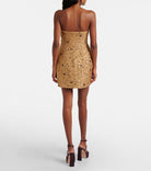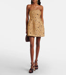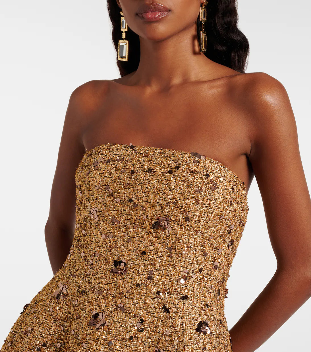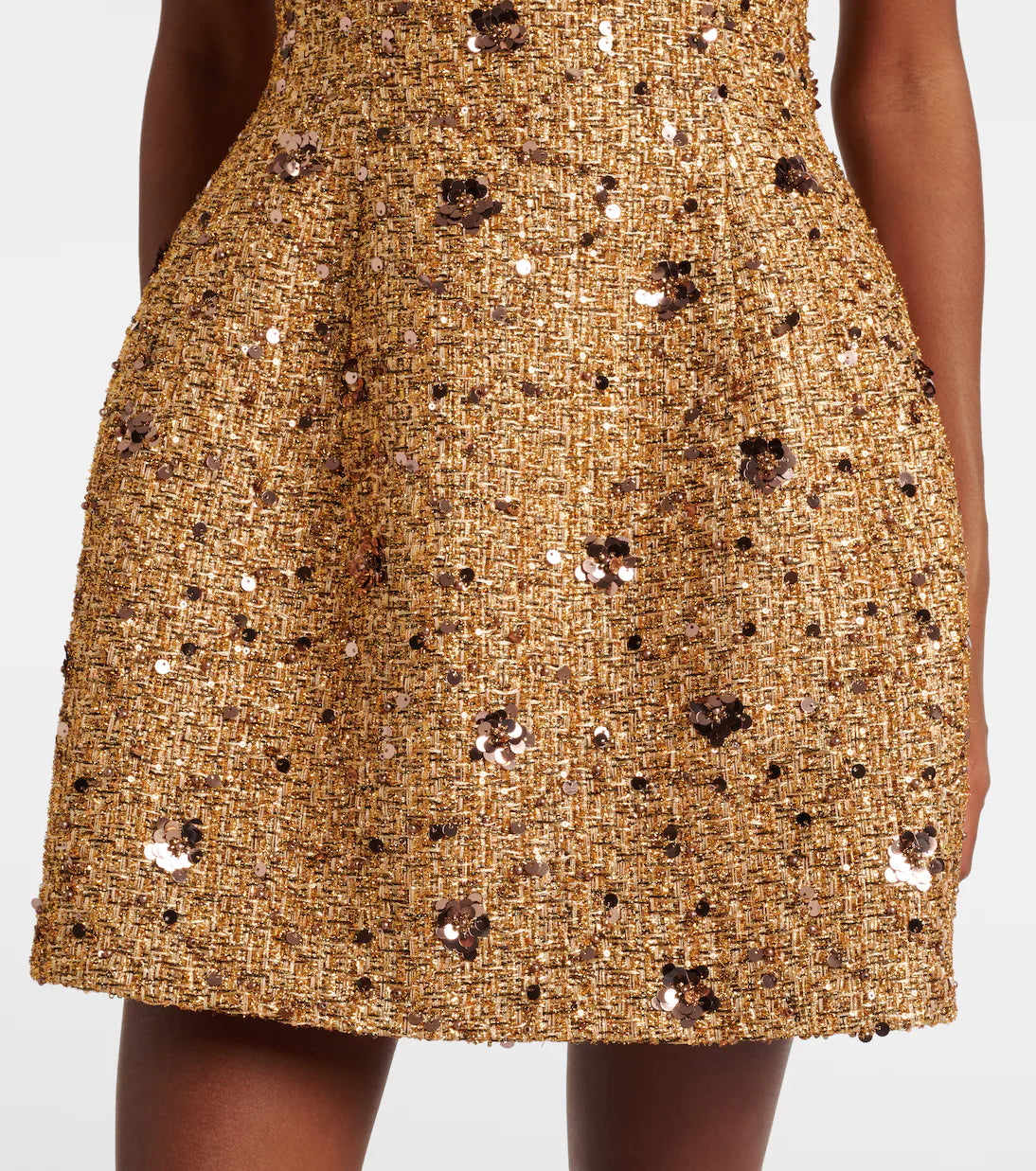 This strapless Simkhai mini channels party-season polish with its gold tweed base scattered in lustrous sequins. The structured bustier fit adds a sculpted confidence, while the playful, A-line silhouette brings an easy sparkle to nights out and modern celebrations.