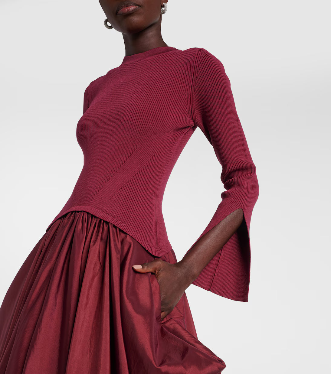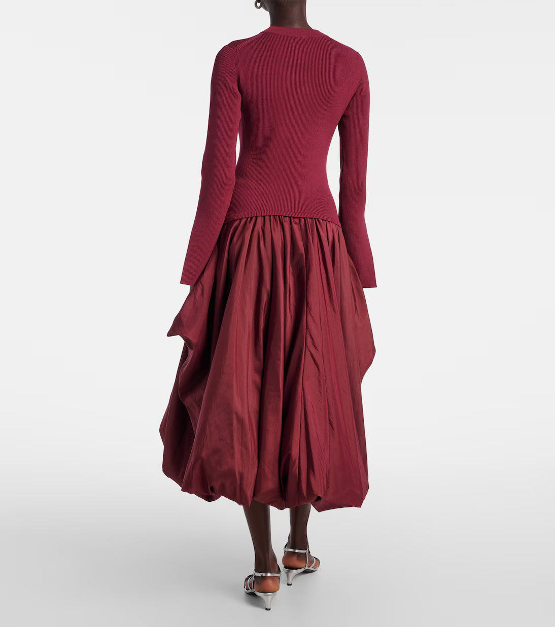 Architectural but make it chic this Simkhai midi dress is a total showstopper. With a sleek knitted top and a voluminous taffeta skirt, it balances structure and flow like a dream. The mix of matte and shimmer gives major main character energy.