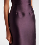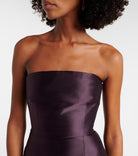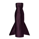 The Imani gown is minimalist drama at its finest — a sleek, strapless column that flares into a sculptural train. Cut in a rich, midnight plum satin, it glows subtly with every step, offering a modern, statuesque presence perfect for high-formality evenings and winter weddings.